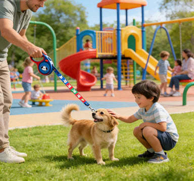 Vibrant red-blue retractable leash featuring cute dog and rabbit prints on the strap, dual braking system, and padded grip. Adds a playful touch to outdoor adventures.
