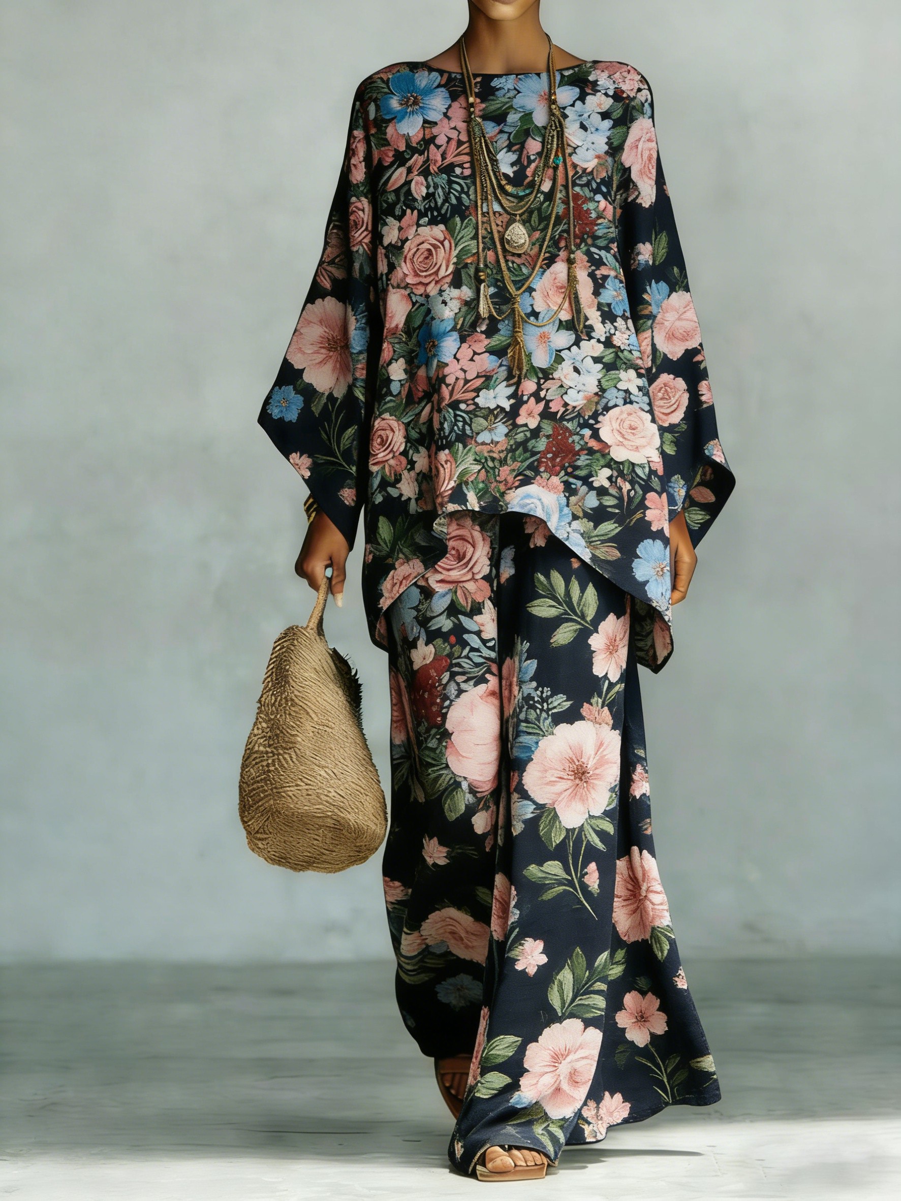 Women's Comfortable and loose print pattern cotton and linen wide-leg pants two-piece set