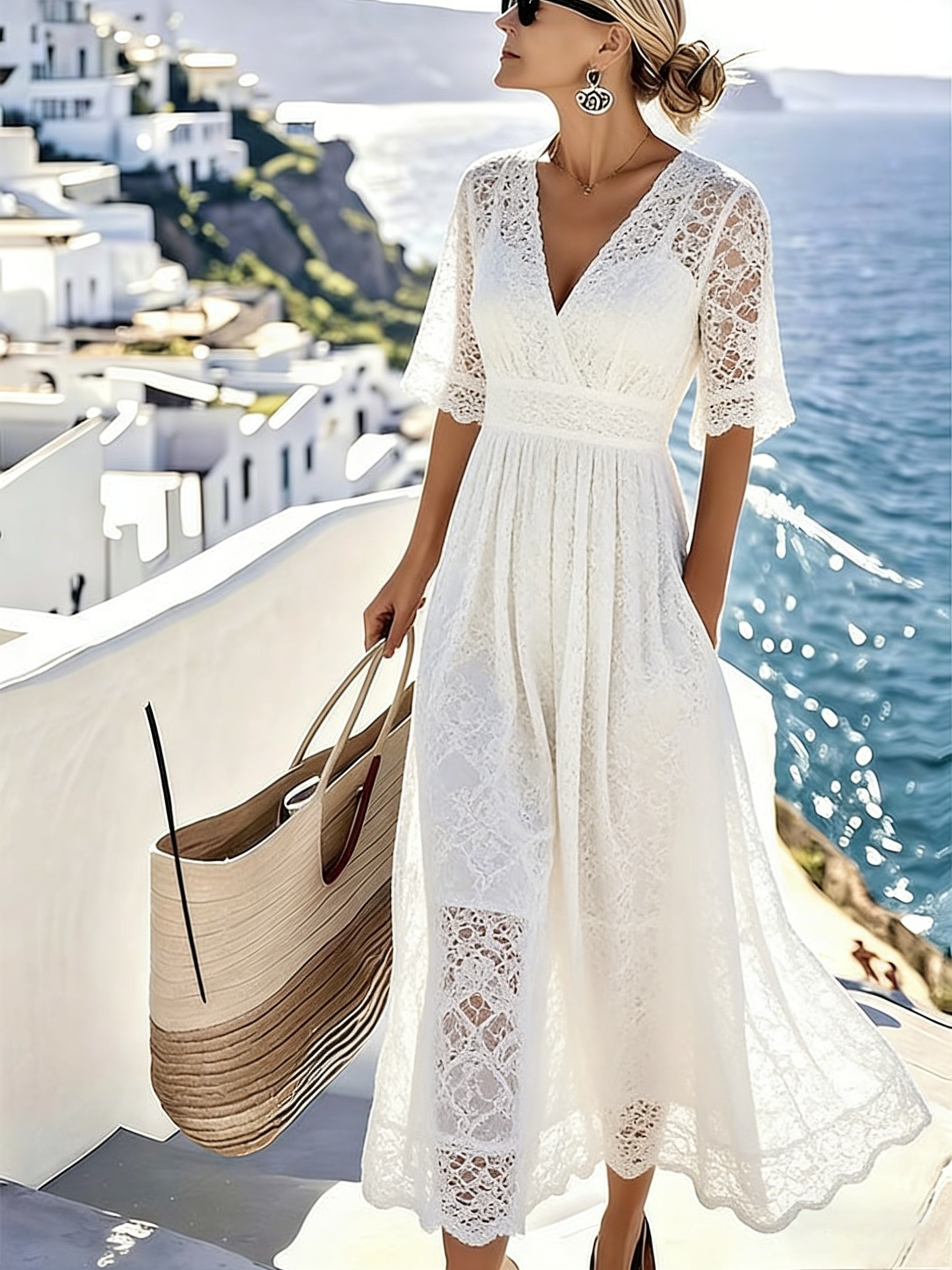 Women's White Lace V-Neck Elegant Dress