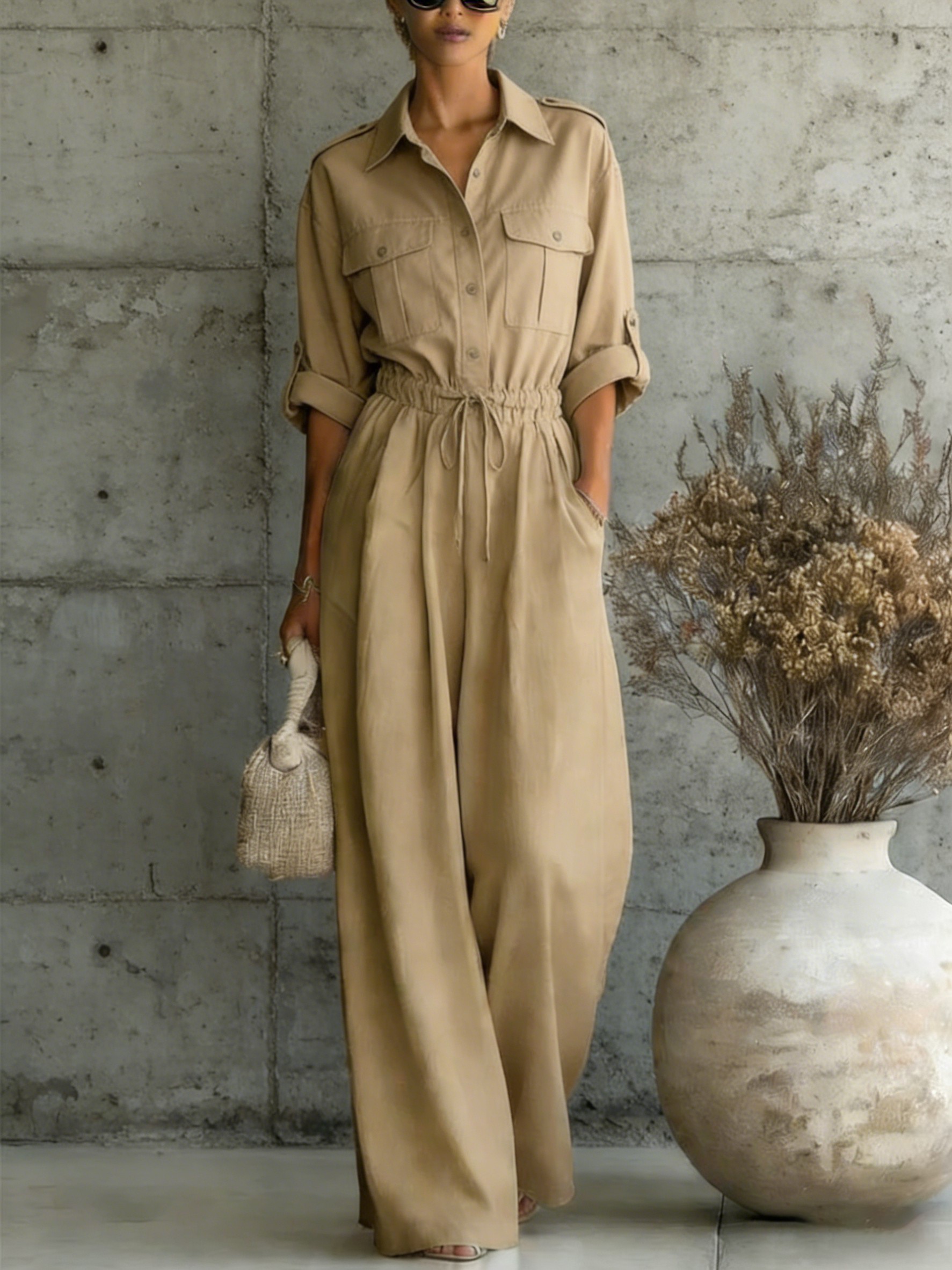 Women's Solid Color Shirt Collar Medium Sleeve Cotton and Linen Jumpsuit