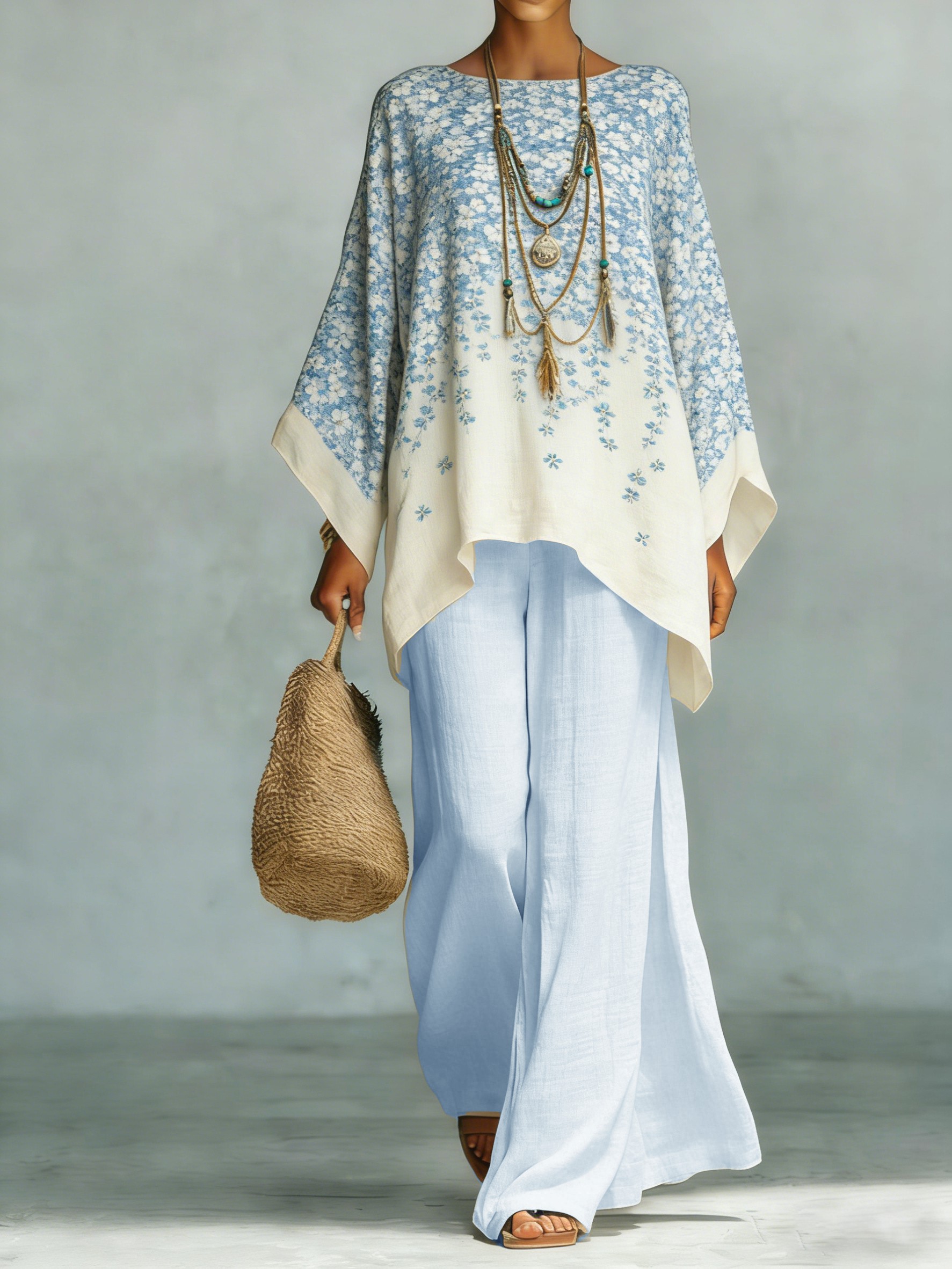 Women's Comfortable and loose print pattern cotton and linen wide-leg pants two-piece set