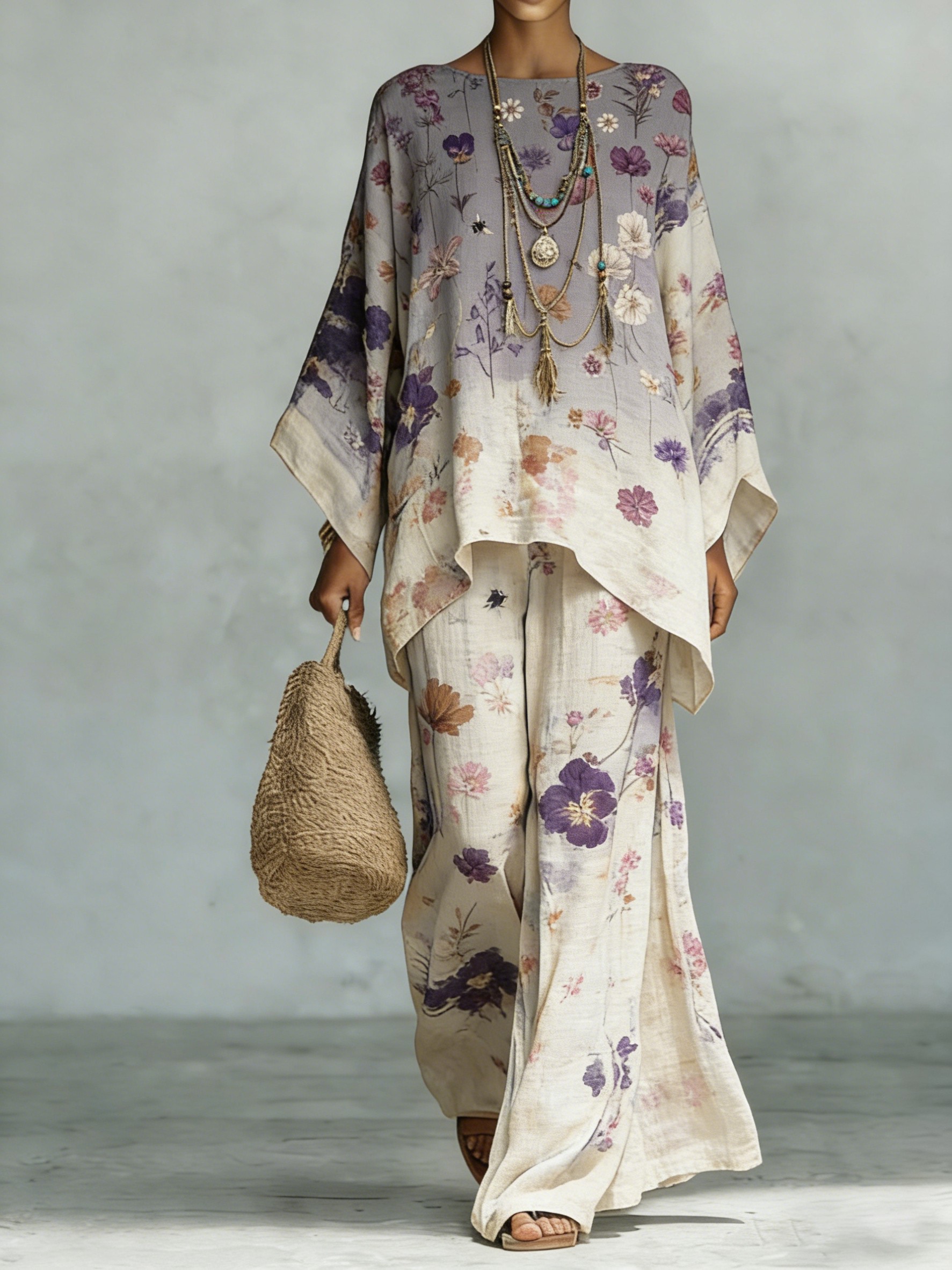 Women's Comfortable and loose print pattern cotton and linen wide-leg pants two-piece set