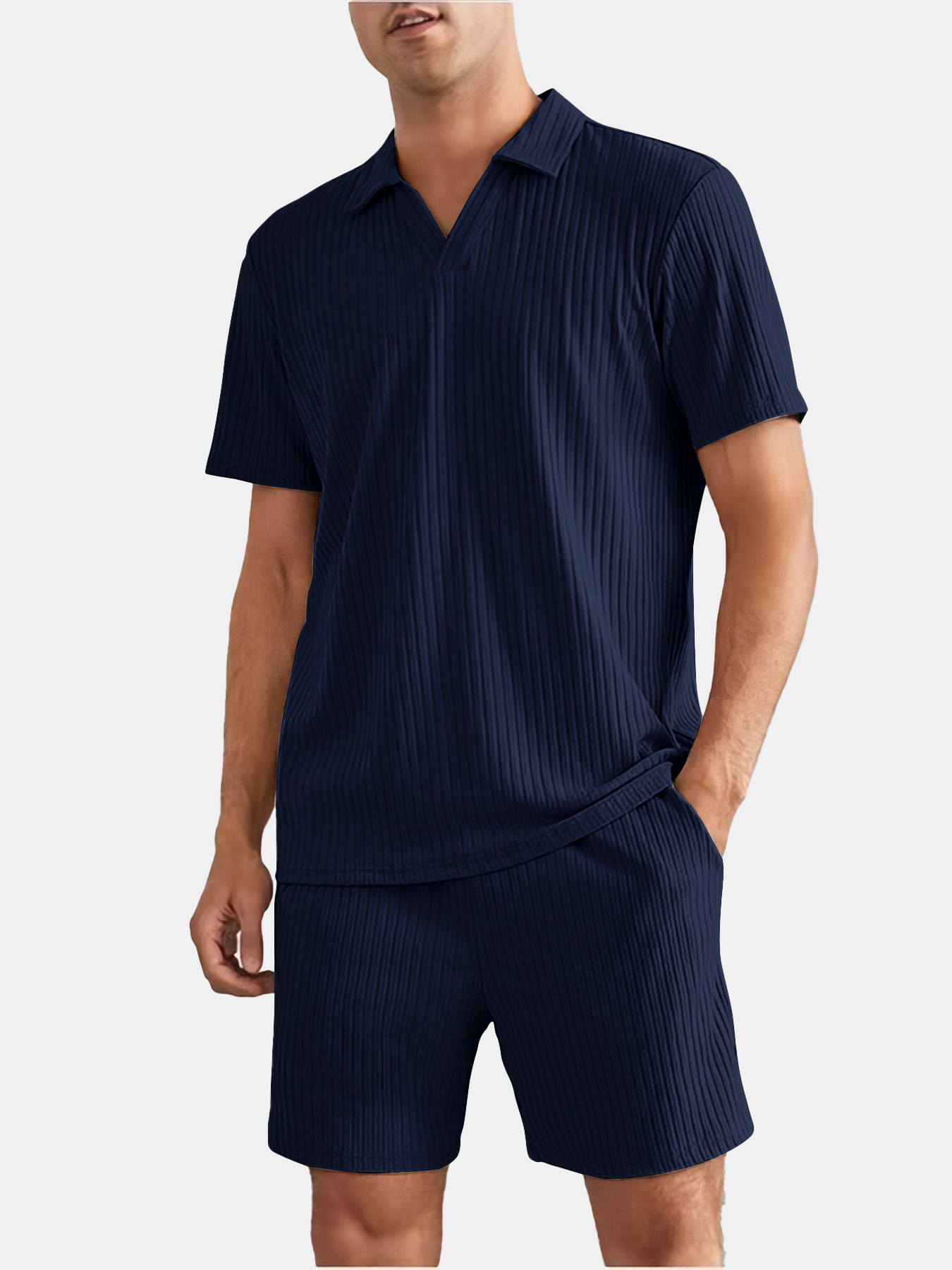 Men's Solid Color Loose Striped Short-sleeved Shorts Polo Suit