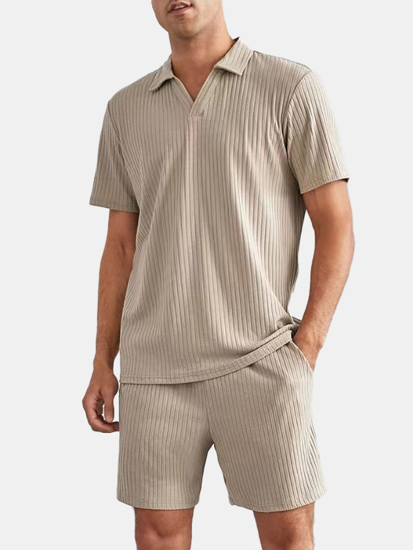 Men's Solid Color Loose Striped Short-sleeved Shorts Polo Suit