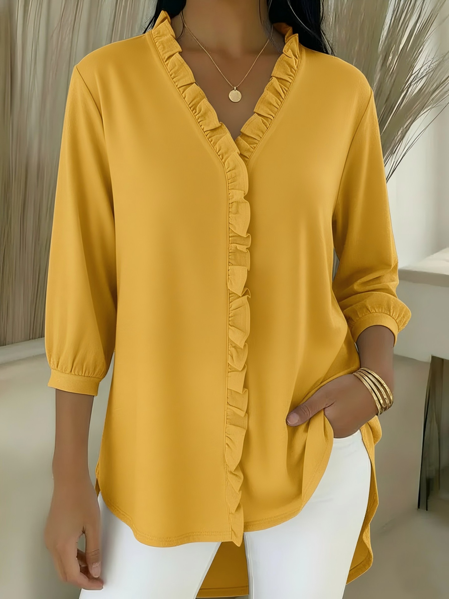 Women's Elegant And Casual Three-Quarter Sleeve V-Neck Solid Color Top With Ruffle Details.
