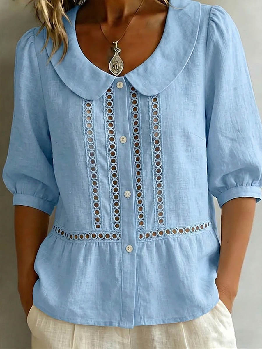 Women's Solid-color Peter Pan Collar 3/4-sleeve Casual Loose Cotton-linen Shirt