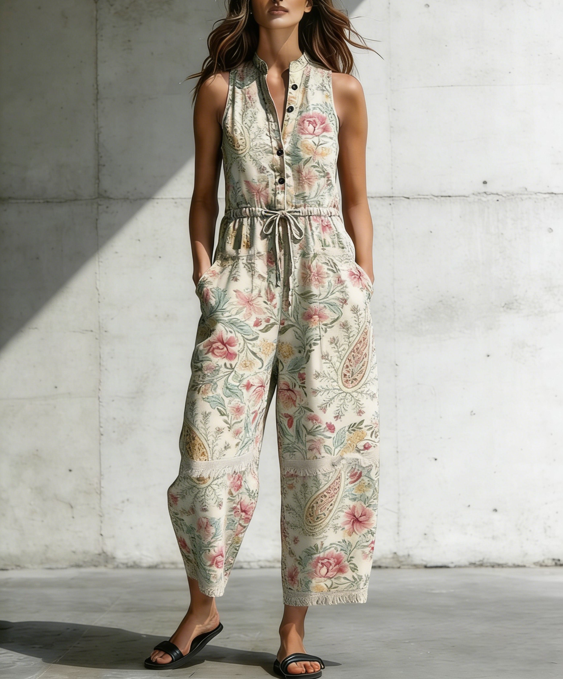 Women's Vintage Print Sleeveless Cotton Linen Jumpsuit